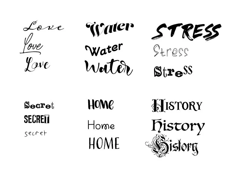 This week I began exploring typography by first experimenting with how fonts and different typefaces can bring across meaning and represent the topic they are illustrating. I started by picking six random nouns and exploring what they represented. The nouns I chose are love, water, stress, secret, home, and history. From there, I began my search to find fonts that I thought best brought their meaning to life. After I found some that I thought represented the nouns, I chose three fonts for each to try and show the meaning of the words.